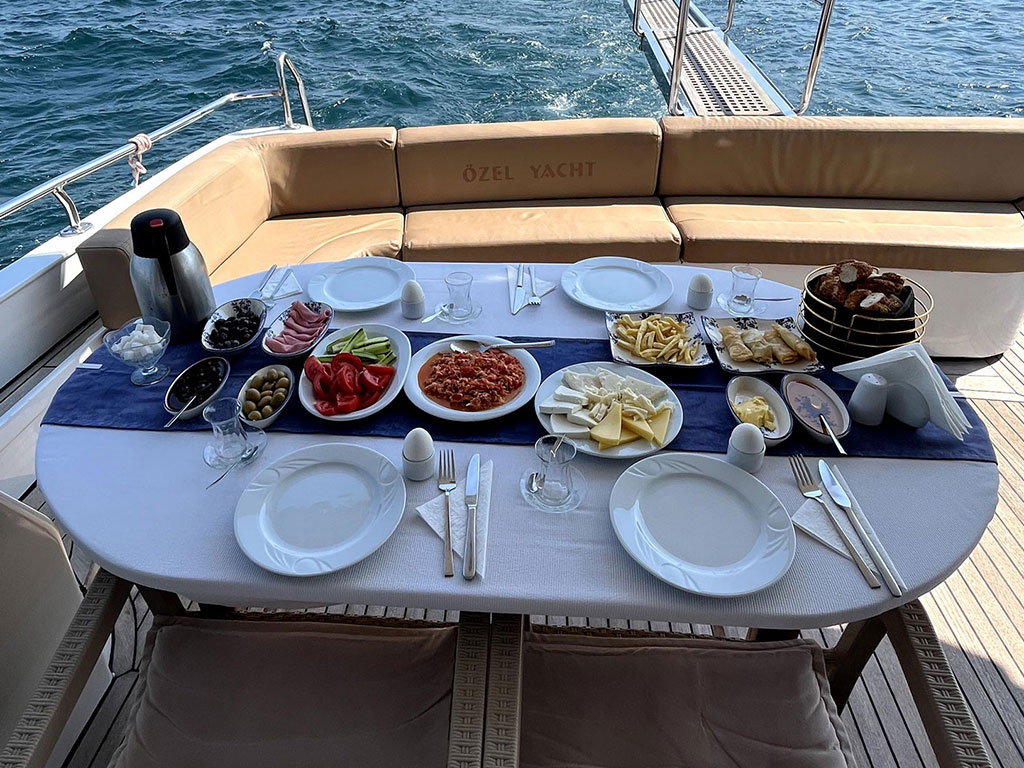 Yat kiralama, serpme kahvaltı servisi ve masa düzenlemesi dahildir. Ekstra talepler (canlı müzik, fotoğraf çekimi, süsleme vb.) ayrıca ücretlendirilir.