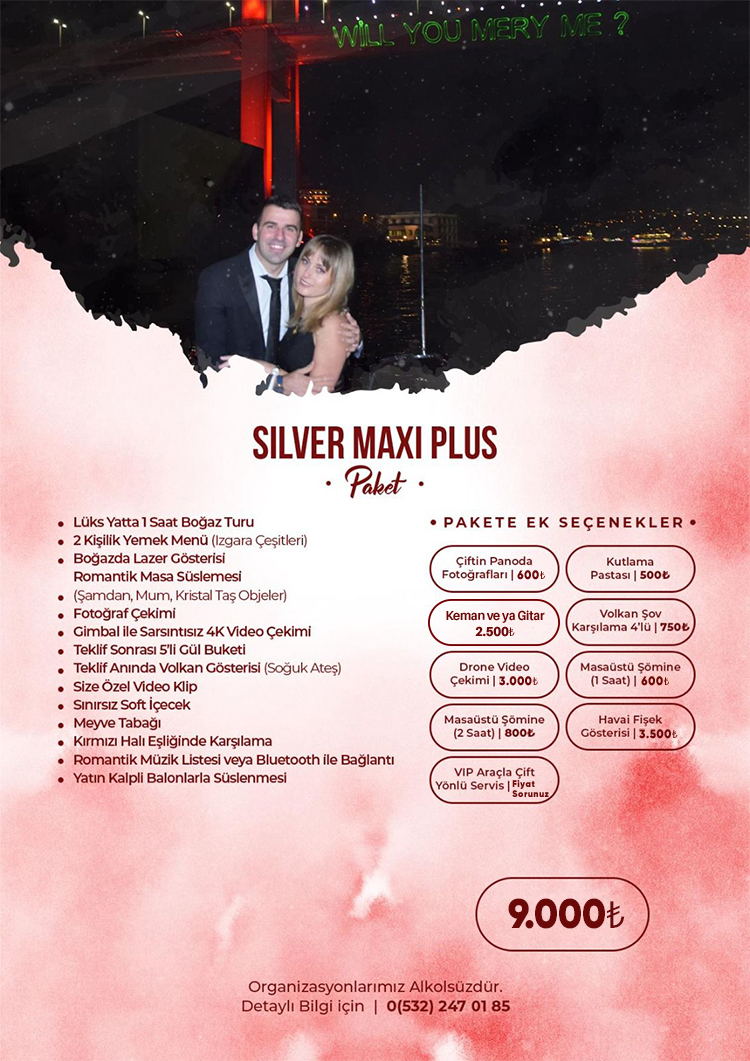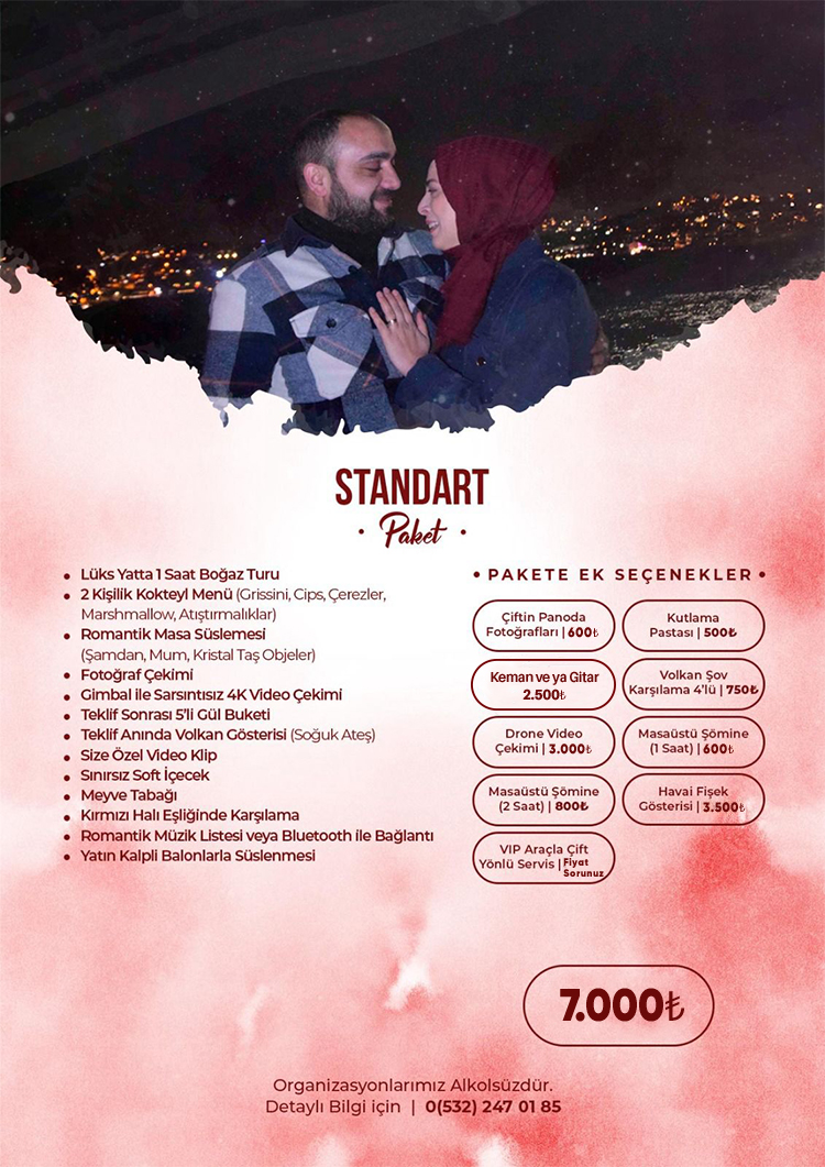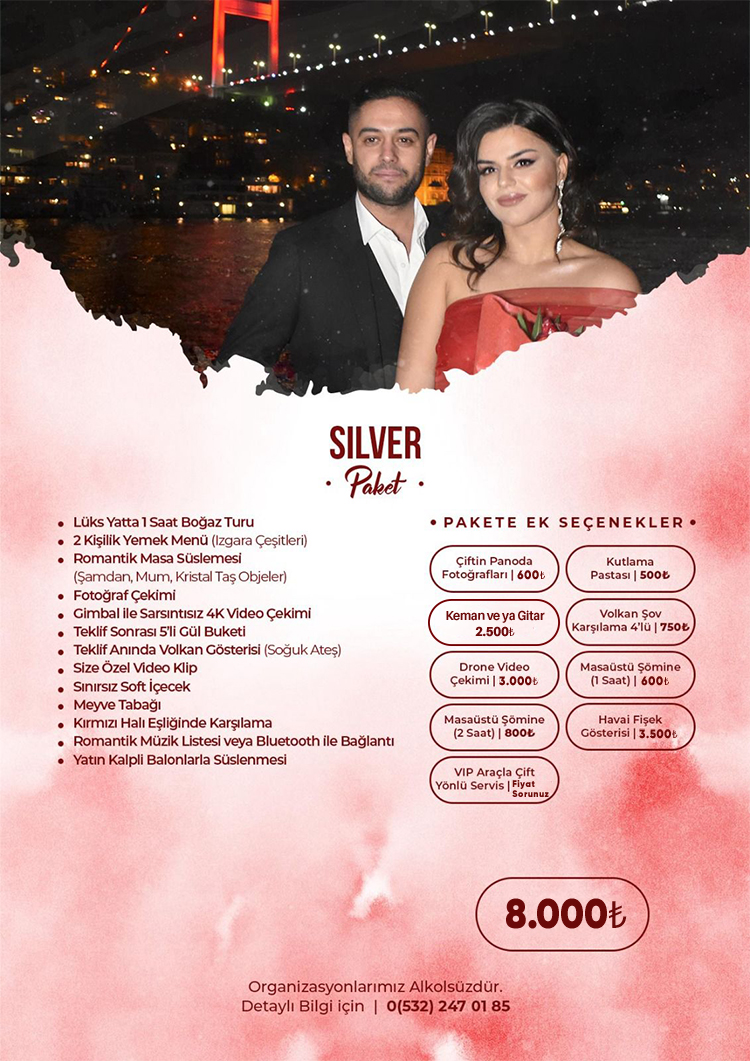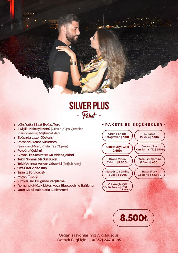 Lüks Yatta 1 Saat Boğaz Turu,2 Kişilik Kokteyl Menüsü (Grissini, Cips, Çerezler, Marshmallow, Atıştırmalıklar), Romantik Masa Süslemesi (Şamdan, Mum, Kristal Taş Objeler), Teklif Anında Volkan Gösterisi (Soğuk Ateş), Sınırsız Soft İçecek, Meyve Tabağı, Kırmızı Halı Eşliğinde, Karşılama, Romantik Müzik Listesi veya Bluetooth ile Bağlantı